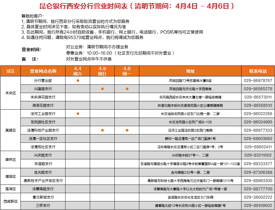 昆仑银行西安分行营业时间表