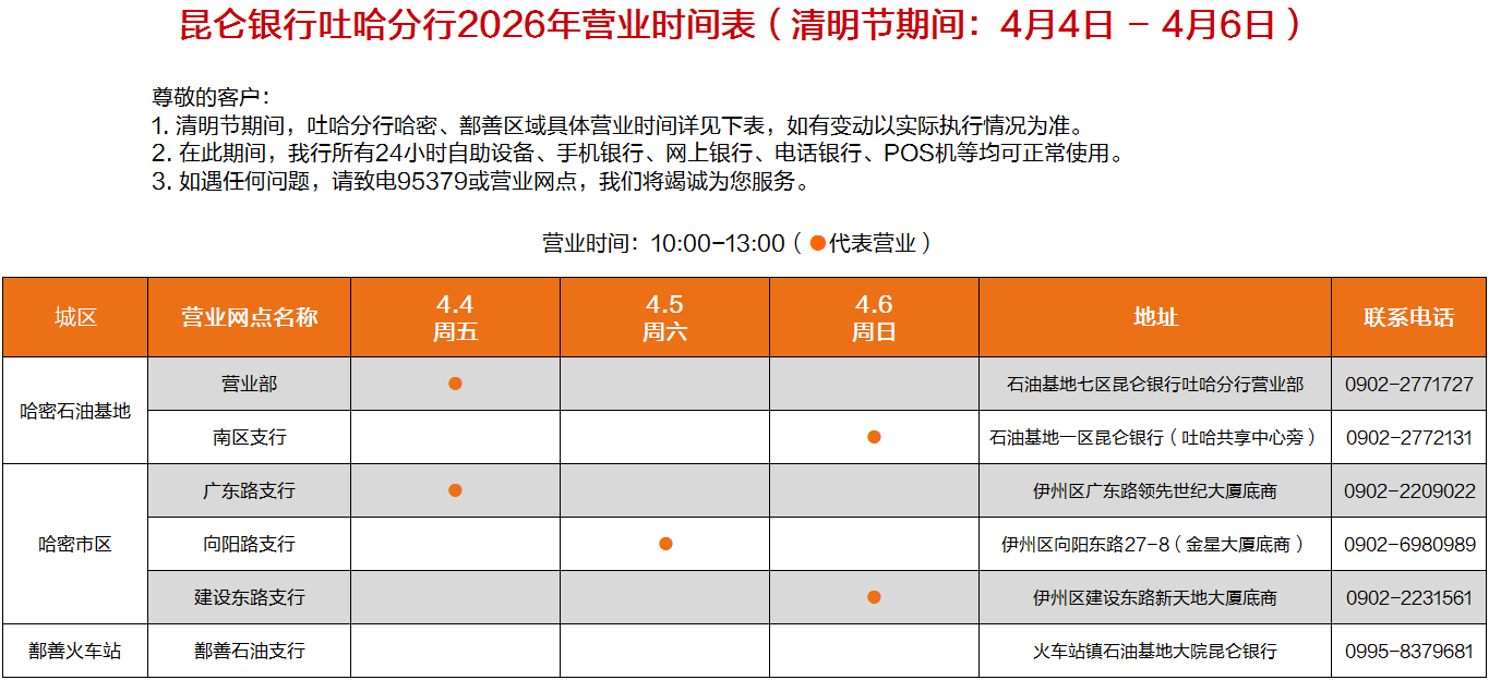 昆仑银行吐哈分行营业时间表