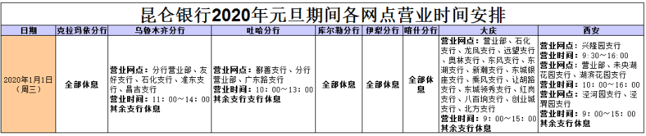 昆仑银行2020年元旦期间各网点营业时间安排 |